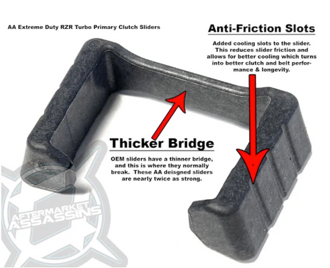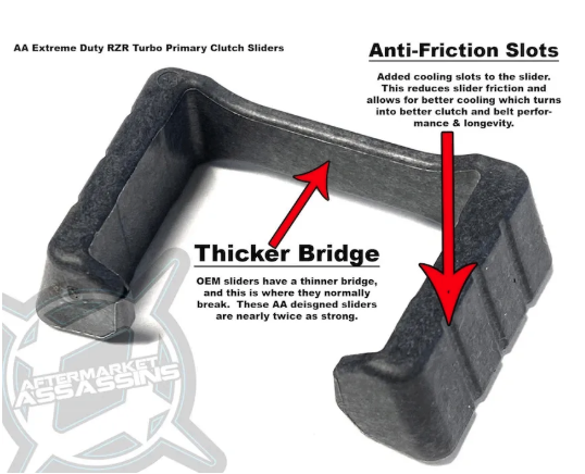 - This kit includes our complete heavy duty AA primary clutch. This clutch is the same design found on the 2016-2020 RZR Turbo models with an encapsulated tower design. We found this clutch to hold power better, hold up better (no exploding), and slip the belt less. It simply meets the demands of these high horsepower vehicles, and is proven. This clutch also holds belt grip better than billet clutches, especially when clutching for higher RPM. This primary clutch is our own version made with higher grade tool steel for the post, assembled with AA HD sliders, to our AA specifications. **Now includes our billet Revolver Clutch Cover with Tower Lock for increased strength and airflow!