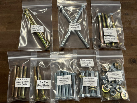 ***This kit DOES NOT include the bolts that are connected together with a metal plate. (Lower front arm front bolt. 6 inner radius rods.***