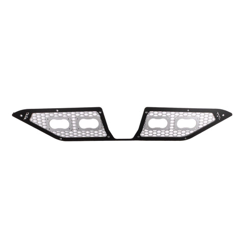 DRT Motorsports Can Am Maverick R Rear Fascia Chase Light Kit is the perfect way to add chase lights to the rear of your Maverick R. Set and installed at the furthest rear point of the vehicle, the DRT Motorsports Can Am Maverick R Rear Fascia Chase Light Kit, provides excellent visibility without any risk obstructions like a spare tire carrier or cargo. While traditional mounting locations are usually located on the cage and over the bed area, this area often gets blocked with the addition of tire carriers, truck enclosures, etc. The DRT Motorsports Can Am Maverick R Rear Fascia Chase Light Kit lets you choose your favorite light brand and add chase lighting that is completely integrated into the OEM rear fascia panel. The DRT Chase Light Kit is made of layered laser cut 6061-T6 aluminum plates that are used to mount and secure the lights. The surround plate is finished in our premium black powder coat while the laser cut mesh panel is finished in a bright anodize. Our mesh design, like the OEM, keeps the plastic from becoming heat saturated by letting heat rise and escape through the mesh profile. We provide premium black plated stainless-steel hardware and a threaded retainer system to bolt into place. DRT Motorsports Can Am Maverick R Rear Fascia Chase Light Kit can easily be customized with powder coat or painted to add a custom look to your ride. Plastic trimming of the OEM rear fascia to install lights is required.