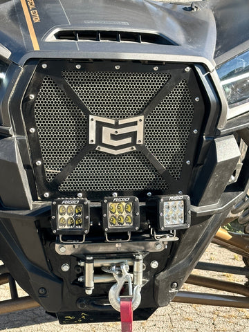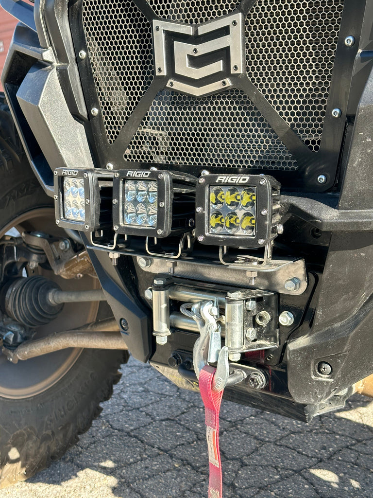 This laser cut and press broke bracket pockets in perfectly with your stock plastics & winch (If you have one) to fit 3 light pods with no modifications. Just simply bolt this on and your ready to light up the night!
