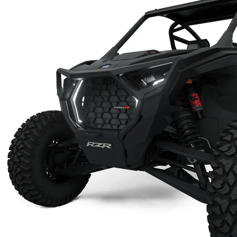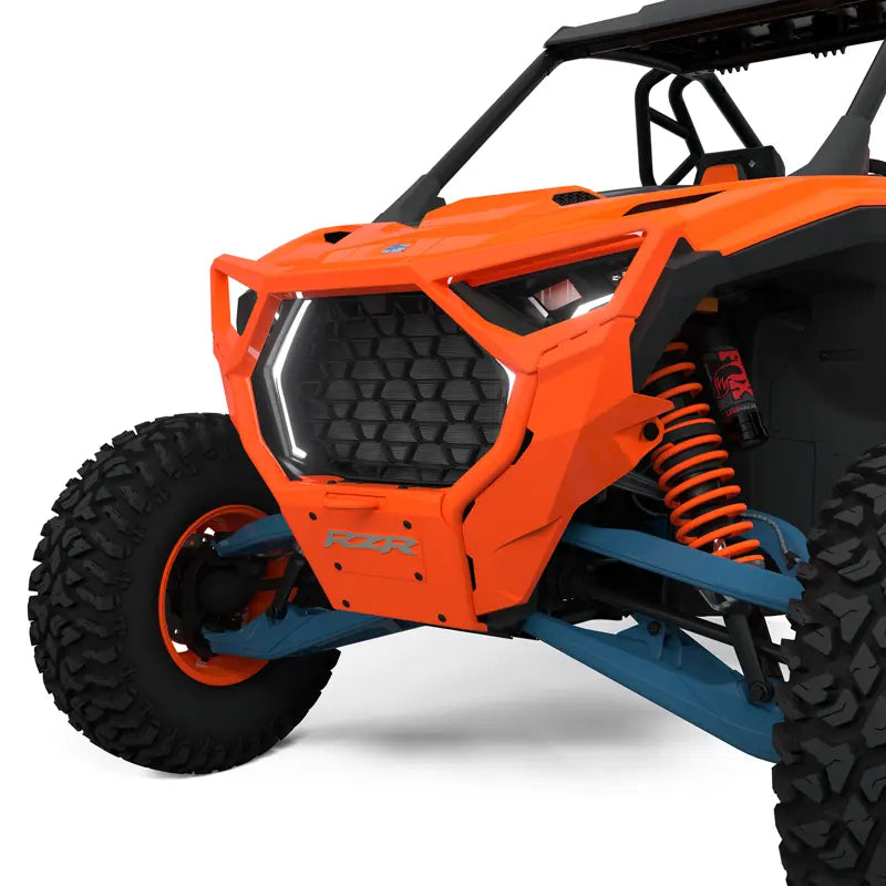Upgrade your RZR with the Front High Coverage Bumper—a rugged and stylish addition that offers both utility and protection. This high coverage front bumper is designed to safeguard valuable components of your vehicle during off-road adventures, minimizing the risk of damage. Constructed with heavy-duty materials, it can withstand impact from obstacles like stumps and rocks. The tubular structure design and cast headlight bezels provide maximum coverage, while a built-in heavy-duty tow point ensures versatility on the trails. The bumper features a silk-screened RZR logo on the front cover plate to complement the aesthetics of your SxS. Designed for easy installation, this RZR front bumper utilizes direct-from-the-factory mounting points. All necessary mounting hardware is included. Choose from color-matched paint options to enhance the style of your RZR. Front plate is removed when bumper is used with a winch.