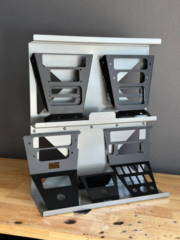 Our dealer display will showcase our console to the fullest! Light enough to hand or sit it down on your shop counter! Room for 4-6 consoles and a few mounts. These stands are made from 14gAllum and put together with 4 bolts. Super easy to carry around when you wanna hit up the shows.