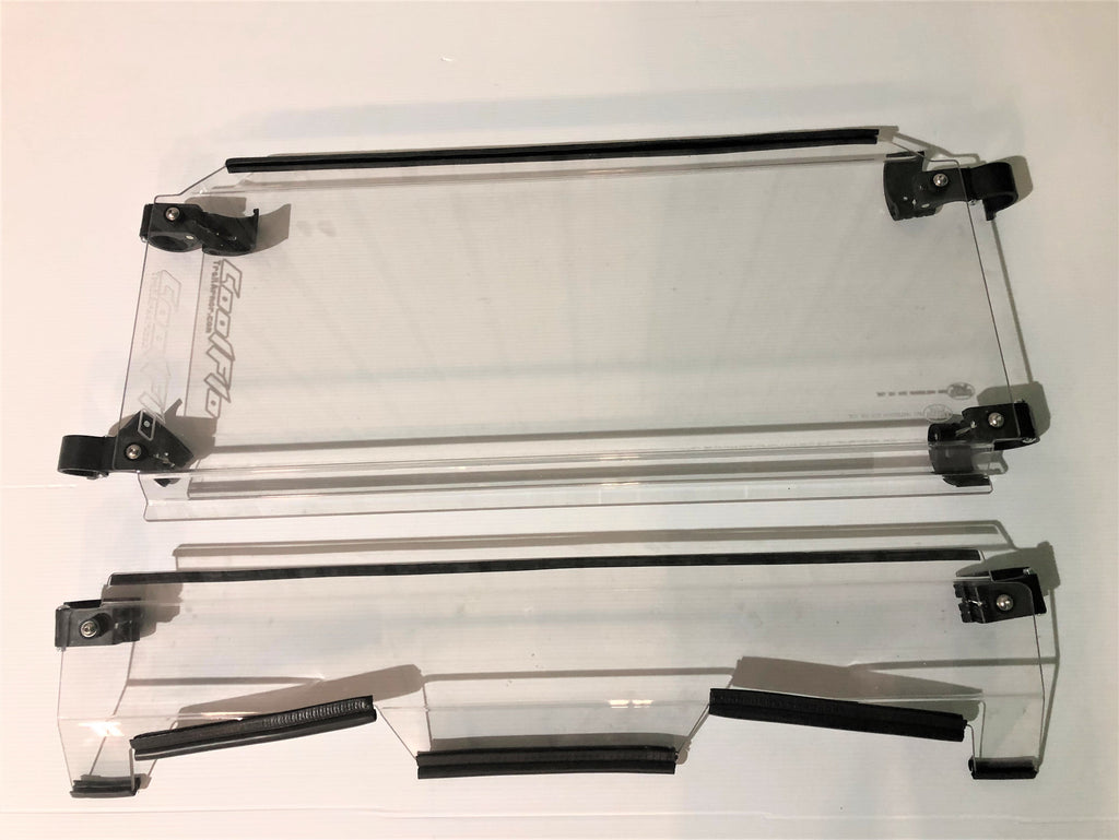 Quick - what is the most common complaint about riding off-road in a side x side vehicle? I'll bet you said "the DUST". Install a windshield and roof and you actually compound the problem. In frustration, many have chosen to give up the protection of a windshield altogether rather than be plagued by the dust and heat. After extensive trail testing, Trail Armor has the answer - the CoolFlo Windshield. This unique two-piece design delivers relief from back draft dust while providing superior face and eye protection. As an added benefit, it also helps by reducing cabin temperature. How are CoolFlo windshields different from other shields on the market? To answer this, let's look at what creates the problem. An open, roll-caged vehicle lets air flow freely while in motion. Put a windshield on the vehicle and the flow of air is changed - a low pressure zone is created behind the windshield. Ever ride in a jeep or convertible car and wonder why your hair blows forward toward the front or windshield? It is because of this low pressure. Automakers have addressed the issue by adding spoilers to roof racks and rear windows to create an air curtain. This works at highway speeds, but the problem still exists at lower trail speeds. It is this low pressure zone that draws the dust into the cab. By simply removing the lower section of the windshield, air is redirected by special foils downward to the floor and backward into the cab, effectively breaking the low pressure zone and forcing trapped engine heat out of the vehicle. The upper portion of the CoolFlo Windshield stays in place for much needed eye and face protection. What if it's too cold to ride without a full windshield? Leave the bottom part on and take it off later if you need to. Others have tried to fix the dust and heat problem by making half or three-quarter windshields. This only reduces the low-pressure zone; it does not break it. And half windshields do not provide adequate eye protection. So, with a half windshield you have no upper protection, only slightly less dust and the cool air is blown over your head without providing any relief. Trail Armor's CoolFlo Windshields, made of 1/4" mar-resistant, hard coated polycarbonate, provide excellent face and eye protection and relieves the dust and heat for a comfortable ride. They are easy to install, and the lower section can be removed and replaced on the fly. See ALSO FITS CHART in gallery for specific year and model fitments.