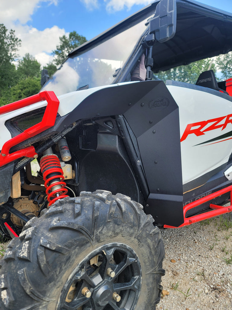 Made of HDPE plastic (textured on face side) custom cut to work with the RZR XP 1000 and RZR XP 4 1000. Fender flare extends an average of 4" past the factory fender (in some places its wider, some places narrower).