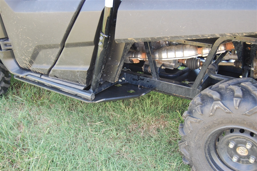 Trail Armor's full skid plate set for the Honda Pioneer 700 2014 - 2024. Made from 1/2" supertough polymer, these plastic skids absorb shock to the bottom of the vehicle with no dents or rust and are lighter than traditional metal skids. Strategically placed drain holes allow dirt and debris to wash out - you don't have to remove them to clean out the belly your vehicle. This skid set also features a convenient oil drain access panel and access to the oil filter. Skids come in easy to install sections that cover the full length and breadth of the vehicle, including the front and rear differential. Integrated side skids help protect outer floor board and rocker panel edges. Mounting hardware and instructions included. A-arm guards shown in picture are sold separately, see product TA011ARMIMP-HP700.